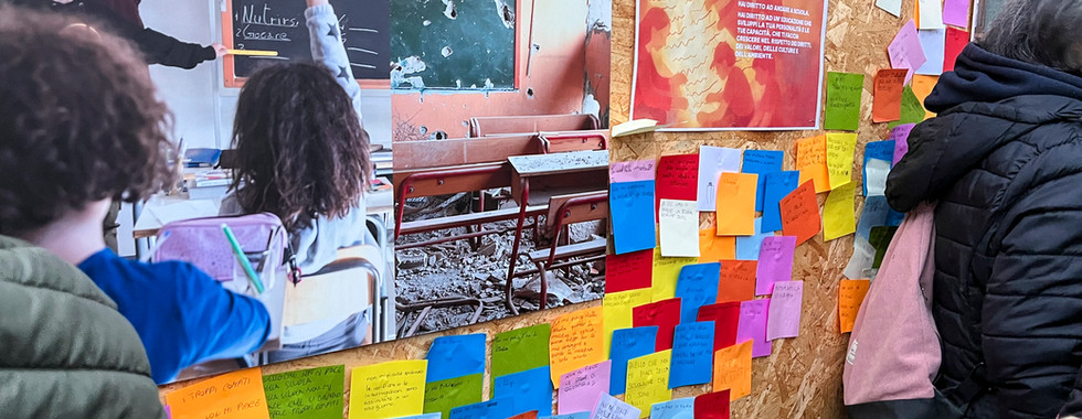 Giochi, riflessioni, abbracci e colori hanno illuminato una giornata grigia, accompagnandoci fino alla marcia con gli 8 totem ricoperti dalle strisce colorate che ricordano i 12.000 bambini di cui rimangono solo i nomi.